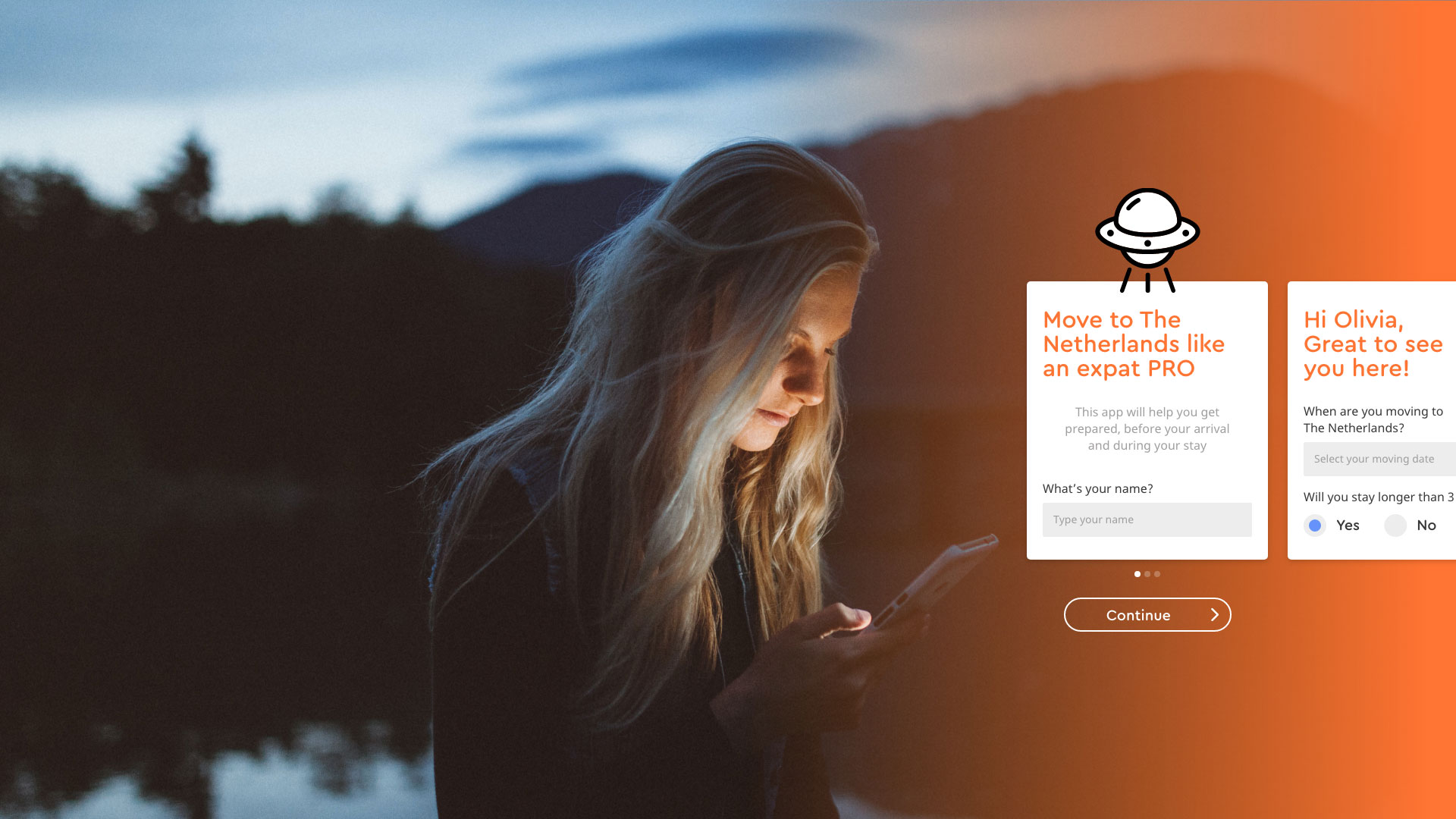 De App start met een inschrijfformulier waarin je het land van herkomst, het bedrijf of instituut waar je gaat werken en de duur van je verblijf in Nederland in kunt vullen. Op basis van deze gegevens maakt de App een handige checklist die gebruikers af kunnen vinken zodat zij direct weten welke acties afgehandeld zijn en welke stappen ze nog moeten nemen voor, tijdens en na hun verblijf in Nederland.